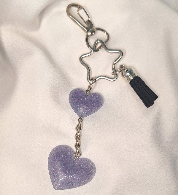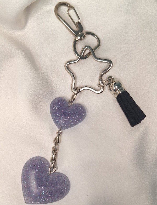 Llavero de resina con dos corazones color violeta con glitter. Con mosquetón para cartera. Borla color negro. Argolla con forma de estrella.