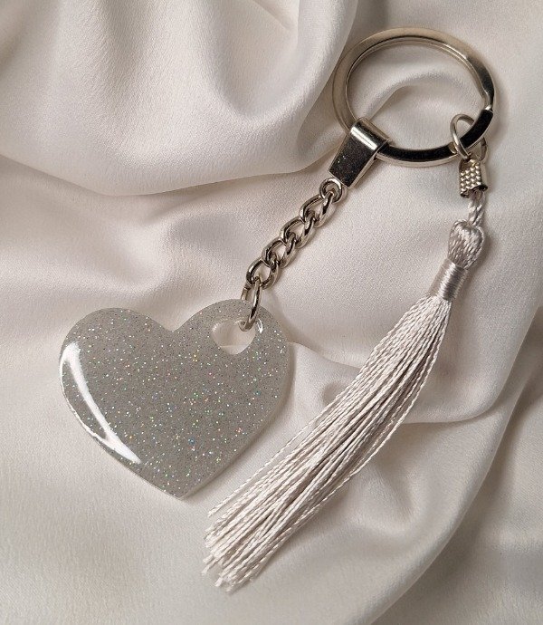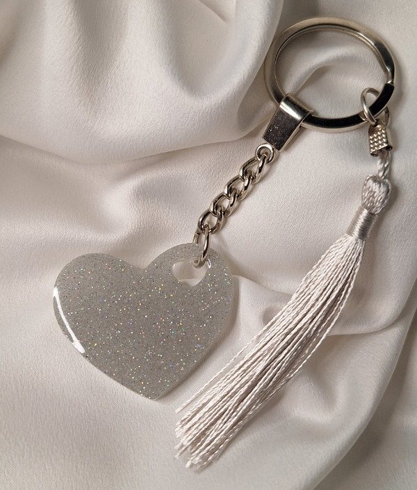 Llavero con forma de corazon, calado. Frente y dorso color gris con brillos y borla al tono.