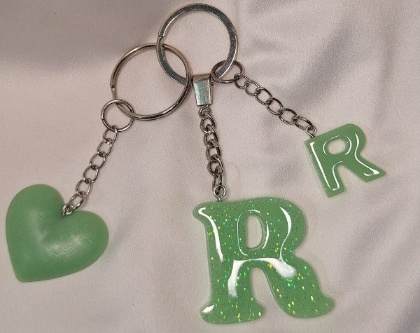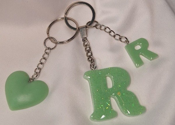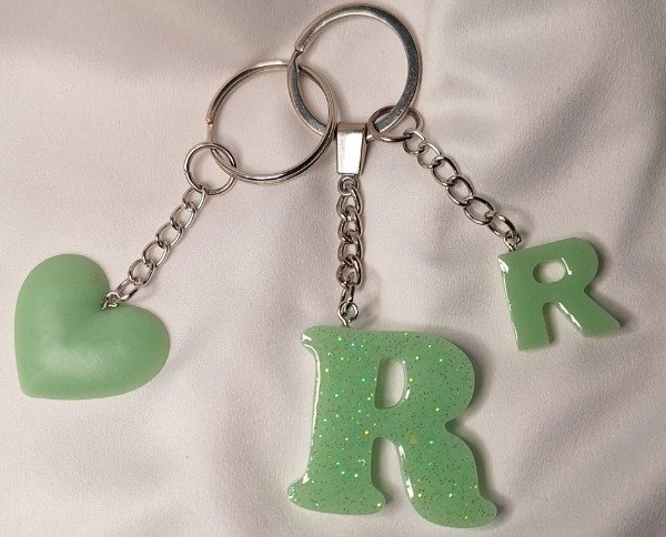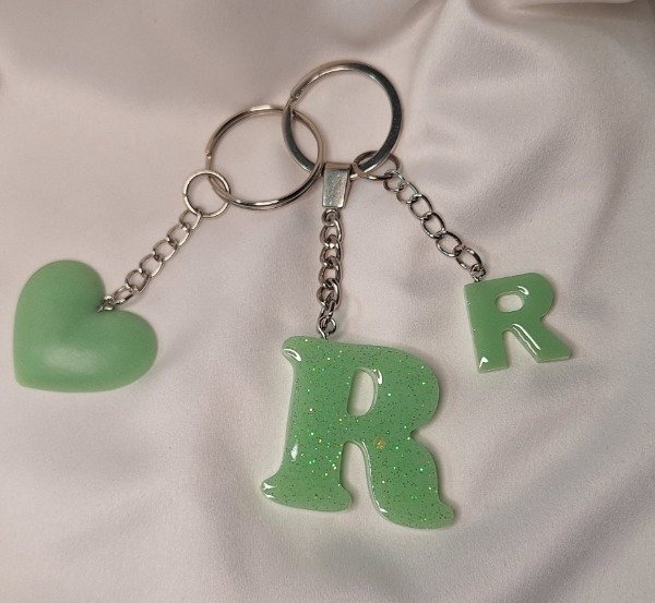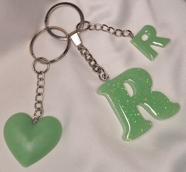 Llavero letra "R" realizado en resina color verde con glitter Con dije chico de letra R y corazón mediano realizado en resina, todo en color verde claro.