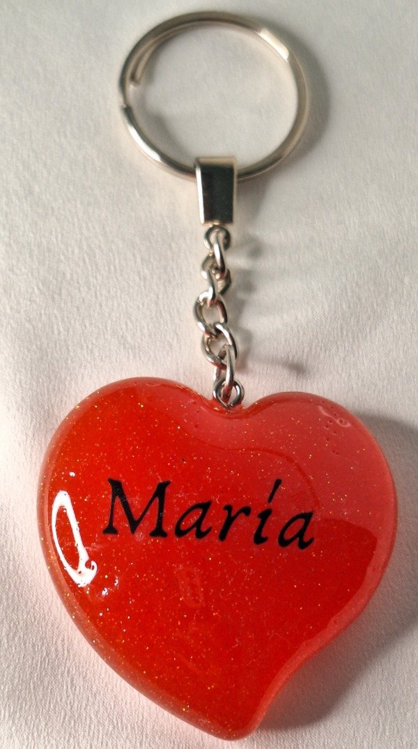 Llavero reforzado realizado en resina con un corazón grande color rojo con glitter y el nombre "María" en color negro.