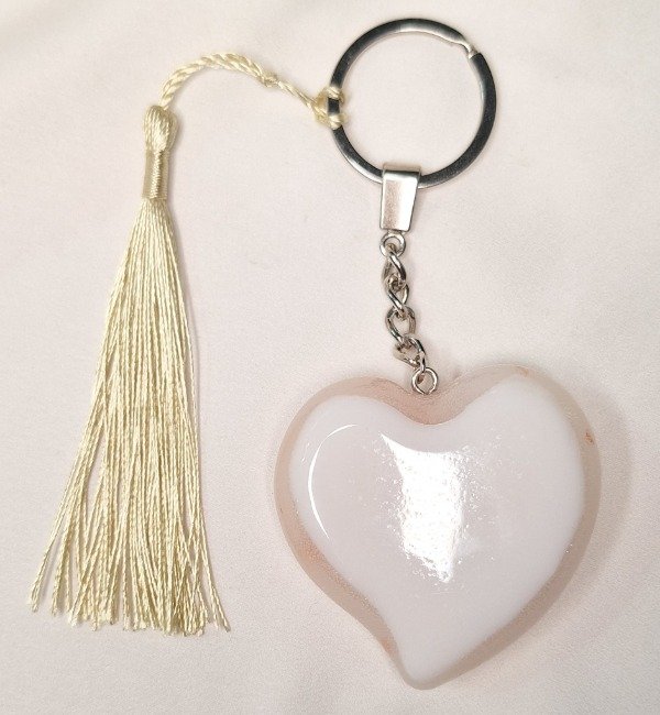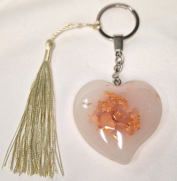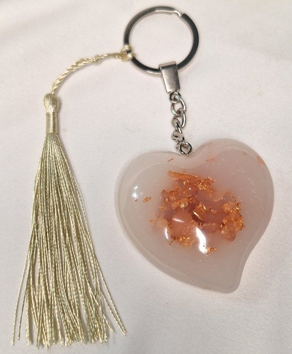 Llavero reforzado realizado en resina con un corazón grande color translúcido con centro color cobre y una borla de hilo de seda color dorado . Dorso color blanco.