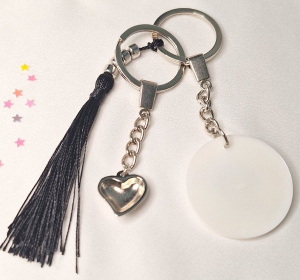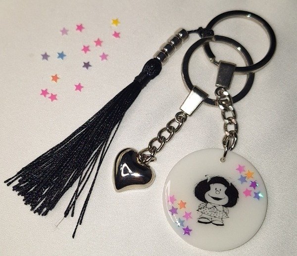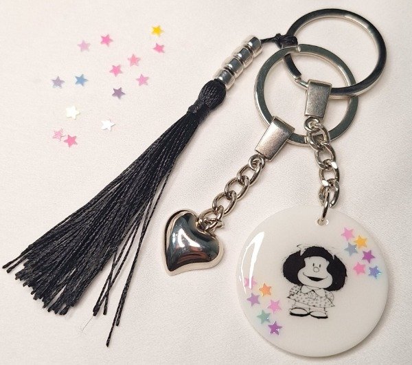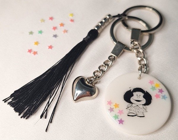 Llavero realizado en resina. Reforzado. Circulo color blanco con dibujo de Mafalda y estrellas color pastel. Con otro llavero con dije de corazón de metal. Con una borla de hilo de seda color negra con detalles de metal.
