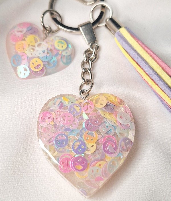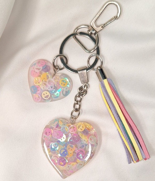 Llavero realizado en resina con un corazón grande y uno mediano con caritas en colores pastel dentro y una borla de gamuza grande en colores pastel. Con gancho para cartera.