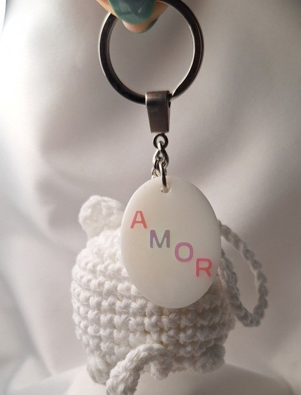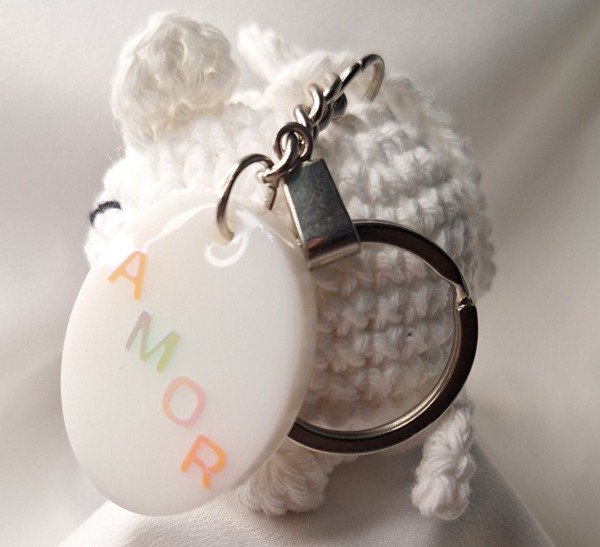 Llavero. Reforzado. Mini amigurumi gatito color blanco. Con dije realizado en resina color blanco con la palabra "amor" en tornasol.
